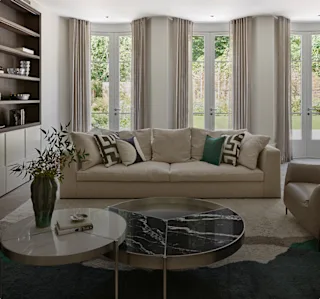 Tasked with redesigning this beautiful family home, Harrods Interior Design injected colour into a calming neutral palette to create a scheme that celebrates the architecture of the building.